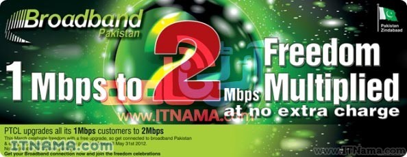 پی ٹی سی ایل کی اس آفر میں 1 ایم بی صارفین 31 مئی 2012 تک اسی قیمت میں 2 ایم بی انٹرنیٹ سپیڈ حاصل کریں گے۔ آفر ختم ہونے کے بعد صارفین کو 2 ایم بی کے چارجز ادا کرنا ہونگے یا اپنا پیکج واپس 1 ایم بی پر منتقل کروانا ہوگا۔ آپ آفر کے ختم ہونے سے پہلے بھی اپنا پیکج پی ٹی سی ایل کی ہیلپ لائین 1236 پر کال کر کے واپس 1 ایم بی منتقل کروا سکتے ہیں۔