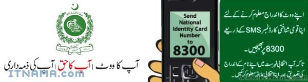 نئی کمپیوٹرائزڈ ووٹر لسٹوں میں اپنا اندراج دیکھنے کے لیے اپنے موبائل فون سے 8300 پر اپنا قومی کمپیوٹرائزڈ شناختی کارڈ نمبر ارسال کریں۔جیسے