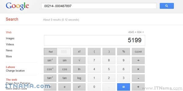 اگر آپ حساب کتاب کے معاملے میں تھوڑے کمزور ہیں تو کوئی فکر کی بات نہیں ، آپ کیلکیولیٹر کا استعمال کیجئے اور آپ کو شاید معلوم ہوگا کہ آپ گوگل سرچ کی مدد سے بھی کیلکیولیٹر کا کام لے سکتےہیں۔ مثلاً آپ گوگل پر 654+4545 سرچ کریں تو گوگل آپ کو فوری 5199 جواب فراہم کر دے گا۔