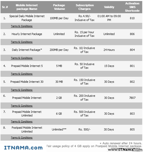- صارفین پیکج کا بقایا انٹرنیٹ اور مدت معیاد #706* ملا کر حاصل کرسکتے ہیں، ہر بار شارٹ کوڈ استعمال کرنے کے چارجز 50 پیسے علاوہ ٹیکس ہونگے۔