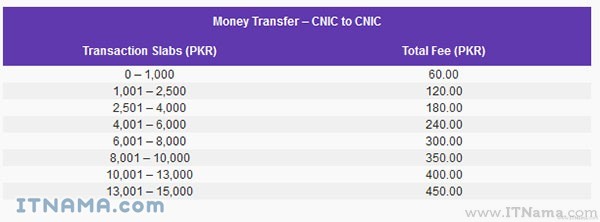 اس سروس کے ذریعے رقم کی منتقلی کی ماہانہ حد 15000 روپے مقرر کی گئی ہے ، آپ اس حد میں رہتے ہوئے جتنی بار چاہے پیسے بھیج سکتے ہیں۔ بلوں کی ادائیگی پر کسی قسم کے اضافی چارجز نہیں ، رقم منتقلی کے سروس چارجز کچھ یوں ہیں: