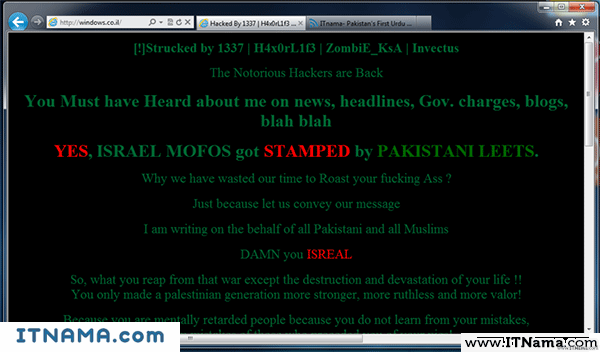 گذشتہ روز ہیکرز کی جانب سے اسرائیل کی بڑی ویب سائیٹس جیسے ایمازون ، بی بی سی ، سٹی بینک ، سی این این ، مائیکروسافٹ، ماسٹرکارڈ، انٹل اور کوکا کولا وغیرہ پر حملہ کیا گیا اور ان پر اپنا پیغام نشر کر دیا۔ اسرائیلی ویب سائٹس پر حملہ کرنے والے ہیکرز نے خود کو 1337, H4x0rL1f3, ZombiE_KsA اور Invectusکے نام سے متعارف کروایا ہے اور یہ گروپ پہلے بھی بھارتی ویب سائیٹس پر حملے کر چکا ہے۔