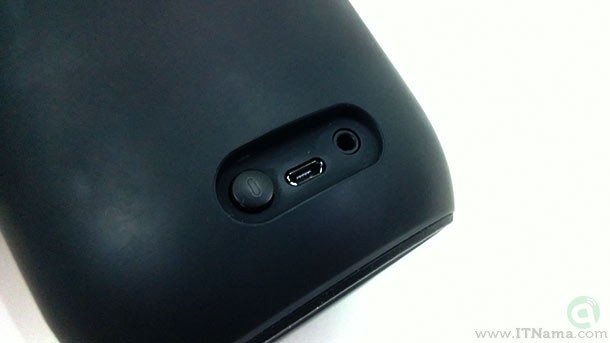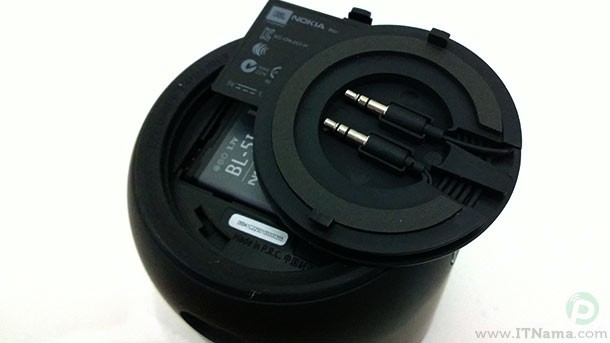 سامنے کی جانب ایک بلیوٹوتھ بٹن بھی موجود ہے جسکے گر سفید رنگ کی لائٹ چمکتی ہے اور اگر کوئی دوسری ڈیوائس اس سے paired ہو تو اسکا رنگ نیلا ہوجاتاہے۔ پلے اپ کی دائیں جانب ہوا کے نکاس کی جگہ موجود ہے جو ووفر کا کام بھی دیتی ہے۔ جبکہ نچلی جانب بیٹری موجود ہے۔ اس سپیکر میں نوکیا کی BL-5J بیٹری استعمال ہوتی ہے۔ بیٹری کور میں آڈیو کیبل بھی موجود ہے۔