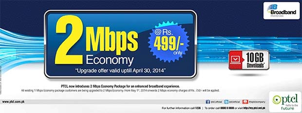 پی ٹی سی ایل کی اپ گریڈ آفر کے تحت تمام 1Mb اکانومی پیکج صارفین کو 2Mb پر مفت منتقل کر دیا گیا ہے۔ یہ آفر 30 اپریل 2014 تو موثر ہے جسکے بعد صارفین کو 750 روپے ماہانہ ادا کرنا ہونگے۔