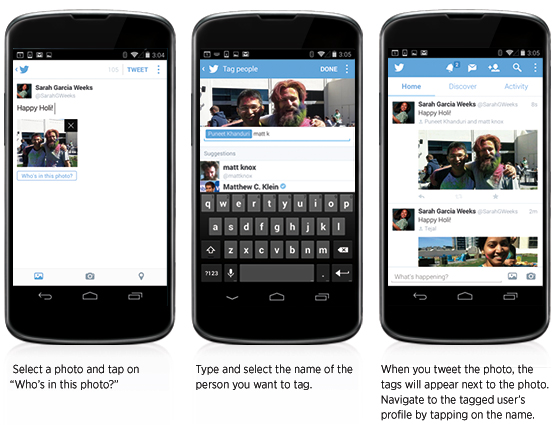 تاہم اس نئے فیچر کی بدولت اب آپ تصویر کے اندر ہی 10 دوستوں کو ٹیگ کرسکتے ہیں۔ ٹیگ کرنے سے آپکے 140 حروف کم نہ ہونگے، کیونکہ یہ ٹیگنگ تصویر میں ہوگی نہ کہ ٹوئیٹ میں۔