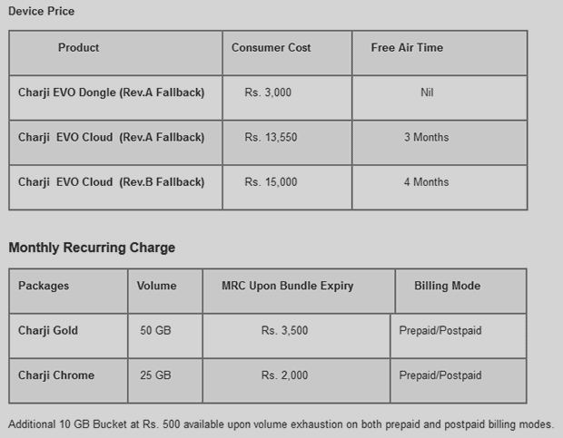چار جی ایوو کلاؤڈ خریدنے والے صارفین کو یکمشت 13550 روپے ادا کرنا ہونگے جس میں تین ماہ کا انٹرنیٹ بھی شامل ہے۔ جبکہ 4 مہینے کے انٹرنیٹ اور Rev. B پر منتقل ہونے والی ڈیوائس کے چارجز 15000 روپے ہیں۔