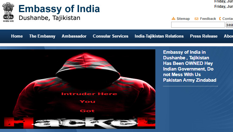 انٹرنیٹ ہیکنگ کے تازہ ترین واقعہ میں، پڑوسی ملک بھارت کی مختلف ممالک میں موجود ایمبیسیز، ہائی کمیشن اور قونصلیٹ کی 7 ویب سائیٹس کو ہیک کر لیا گیا۔ ہیکرز نے اپنا تعلق پاکستان سے ظاہر کیا ہے اور ہیک کیے جانے والی ویب سائیٹس پر پاکستان اور افواج پاکستان کے حق میں نعرے لکھے ہیں۔