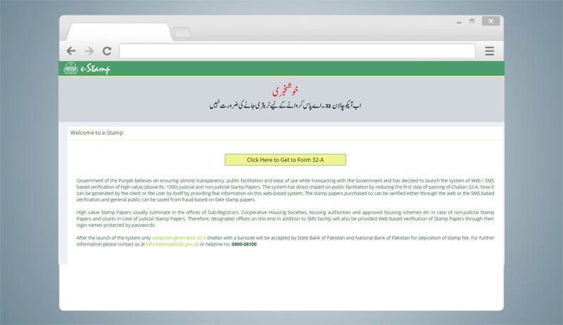 ای سٹیمپ پیپر کے ذریعے اب صارفین کو سرکاری دفاتر کے چکر نہیں لگانے ہونگے بلکہ وہ ویب سائیٹ سے چالان 32-A حاصل کرسکیں گے۔